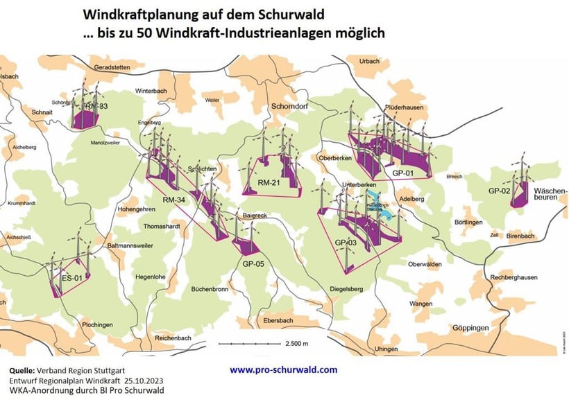 Der Regionalverband Stuttgart hat den Entwurf für eine neue Windkraftplanung vorgelegt. Für den Schurwald sind darin 22 Windkraftflächen in 8 Windkraft-Vorranggebieten vorgesehen. Für Baltmannsweiler und Hohengehren sind hier das Vorranggebiet ES-01 mit nur 800 - 1.000 Meter Abstand direkt vor Baltmannsweiler (Nähe Grillplatz Saatschule und Landstraße nach Esslingen), sowie das Gebiet RM-34 Goldboden - Kaisersträssle besonders relevant.
